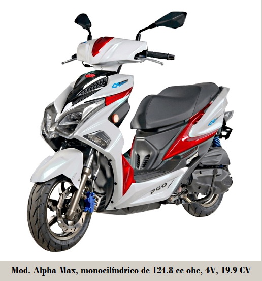 • Alpha Max: 124.8 cc 4V 19.9 CV / 8 500 rpm, compresión 10.0:1, horquilla trailing link, frenos de disco con ABS CBS D/T ø 245 mm (triple pistón) / ø 200 mm (doble pistón), neumáticos D/T 110 - 70-12" / 120 - 70-12", tanque 7.5 L y 123 kg.