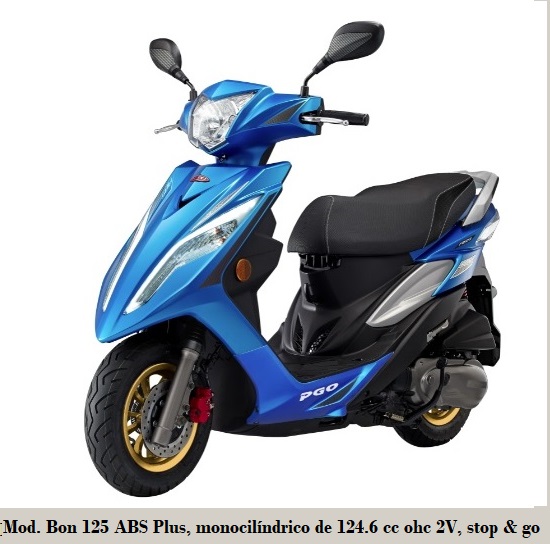 • Bon 125 ABS Plus: 124.6 cc 2V 10.1 CV / 8 000 rpm, compresión 10.0:1, "stop & go" parada inactiva para reducir emisiones gases, suspensión D/T horquilla trailing link telescópica / doble amortiguador ajustable, frenos D/T disco ø 200 mm (doble pistón) / tambor, neumáticos D/T 3.50 x 10", tanque 5.8 L y 113 kg.