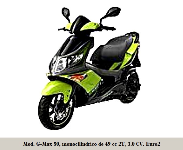 • G-Max 50: de 49 cc 2T, 3.0 CV / 6 250 rpm, Euro2, compresión 6.8:1, embrague centrífugo, suspensión D/T horquilla trailing link telescópica / doble amortiguador ajustable, frenos D/T disco / tambor, neumáticos D/T 120 - 70-12" / 130 - 70-12", transmisión final por correa, tanque 7.5 L y 105 kg. 2010
