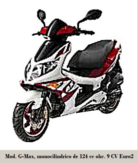 • G-Max 125: de 124 cc 9.0 CV / 7 750 rpm, Euro3, compresión 9.2:1, frenos de disco D/T 2 pistones / simple pistón, neumáticos D/T 120 - 60- 13" / 130 - 60-13", 129 kg. 2010
