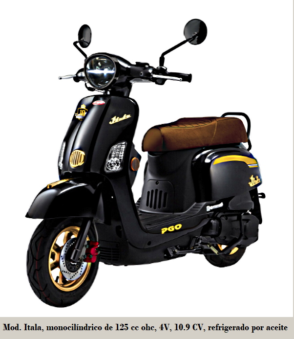 • Itala: 4V, refrigerado por aceite, parada inactiva para educir emisiones gases, suspensión D/T horquilla telescópica trailing link / doble amortiguador ajustable, frenos de disco D/T, llantas de aluminio
