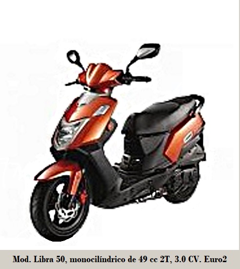 • Libra 50: de 49 cc 2T, 3.0 CV / 6 250 rpm, Euro2, compresión 6.8:1, embrague centrífugo, suspensión D/T horquilla trailing link telescópica / doble amortiguador ajustable, frenos D/T disco / tambor, neumáticos D/T 120 - 70-12" / 130 - 70-12", transmisión final por correa y 98 kg. 2010