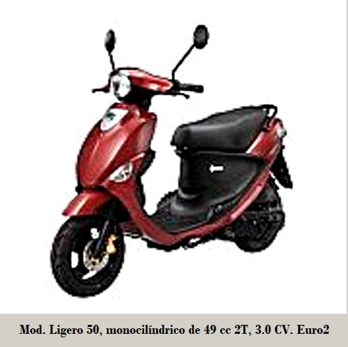 • Ligero 50: de 49 cc 2T, 3.0 CV / 6 250 rpm, Euro2, embrague centrífugo, suspensión D/T horquilla trailing link telescópica / doble amortiguador ajustable, frenos D/T disco / tambor, neumáticos 120 - 70-12" / 130 - 70-12", transmisión final por correa, tanque 6.0 L y 98 kg.
