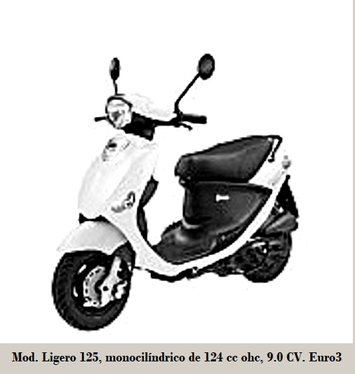• Ligero 125: de 124 cc, 9.0 CV / 7 750 rpm, Euro3, suspensión D/T horquilla telescópica leading link / doble amortiguador ajustable, neumáticos D/T 90 - 90-10", tanque 6.7 L y 102 kg; resto como el anterior. 2010