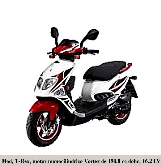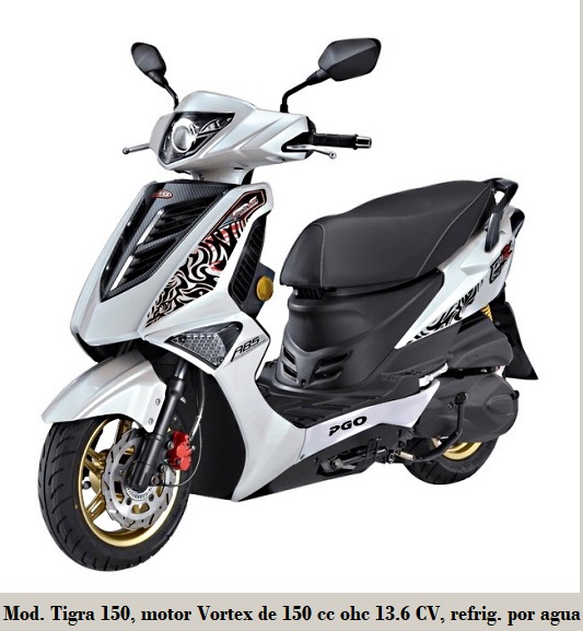 • Tigra 150: motor Vortex ¹de 150 cc ohc 13.6 CV / 8 500 rpm, refrigerado por agua, compresión 11.3:1, suspensión D/T horquilla telescópica trailing link / doble amortiguador ajustable, sistema ECU, frenos de disco doble pistón con ABS D/T ø 245 / ø 220 mm, neumáticos D/T 110 - 70-12" / 130 - 70-12", tanque 6.8 L y 131 kg. 2011