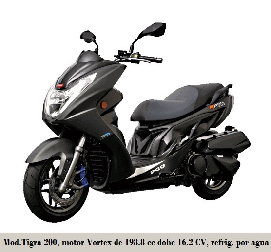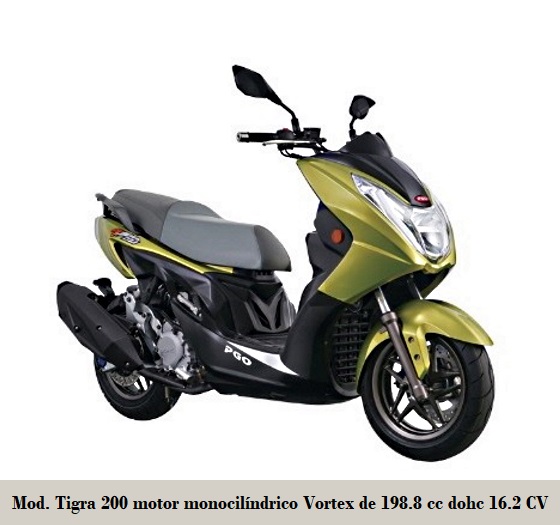 • Tigra 200: motor Vortex de 198.8 cc dohc 16.2 CV / 8 500 rpm, compresión 10.8:1, sistema ECU, suspensión D/T horquilla telescópica trailing link / doble amortiguador ajustable, frenos de disco con CBS y ABS D/T ø 267 mm (4 pistones) / ø 245 mm (2 pistones), suspensión D/T horquilla telescópica trailing link / monoshock, neumáticos D/T 120 - 70-13" / 140 - 70-13", tanque 8.0 L y 156 kg.