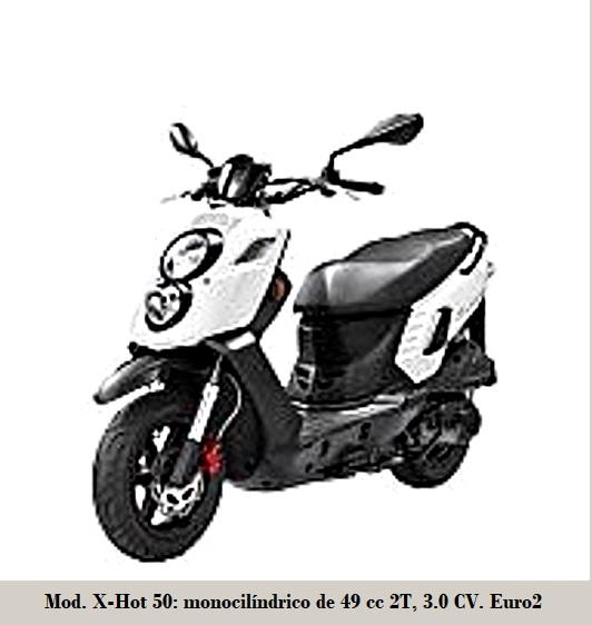 • X-Hot 50: de 49 cc 2T, 3.0 CV / 6 250 rpm, Euro2, compresión 6.8:1, embrague centrífugo, suspensión D/T horquilla telescópica trailing link / doble amortiguador ajustable, frenos D/T disco / tambor, neumáticos 110 - 70-12" / 120 - 70-12", transmisión final por correa, tanque 6.0 L y 98 kg. 2010