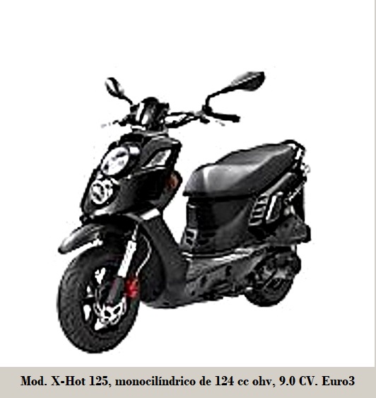 • X-Hot 125: de 124 cc 4T, 9.0 CV / 8 250 rpm, Euro3 compresión 9.9:1 CV embrague centrífugo, 118 kg; resto como el anterior. 2010
