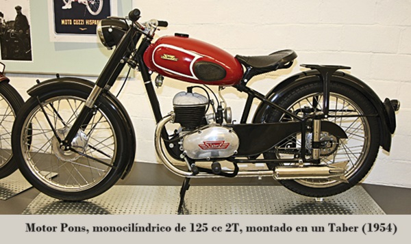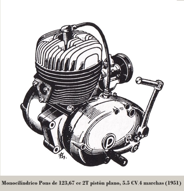 J. Pons, responsable de "Construcciones Electromecánicas", con sede en Barcelona, fabricó un motor monocilíndrico de 123.67 cc 2T con pistón plano, barrido Schnürle, de 5.5 CV / 5 250 rpm, 4 marchas comandadas por el pie, embrague multidisco en baño de aceite, carburador Irz ø 17 mm, encendido por volante magnético Marelli MAV 200A, transmisión P/S por cadenas y un consumo de tan solo 2.5 L/100 km.