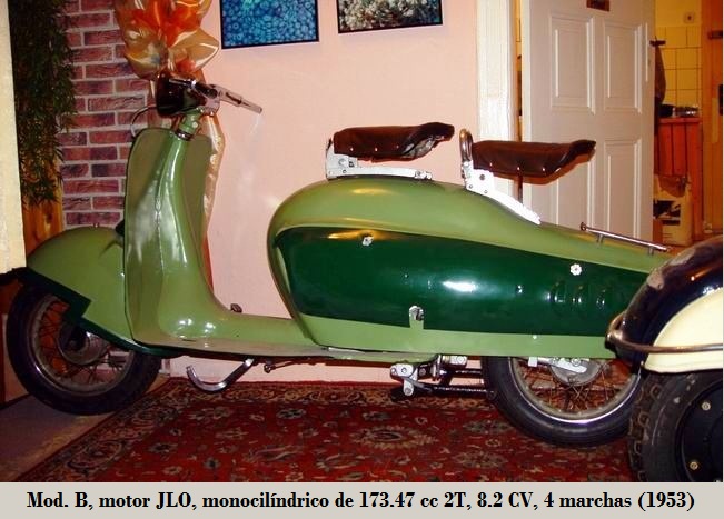 - Mod. B: de 173.47 cc, 8.2 CV, 4 marchas, neumáticos D/T 3.0.12", velocidad máxima 85 km/h, tanque 5.0 L (consumo de 2.8 L/100 km) y 85 kg de peso. Producción 100 unidades. 1950-1953