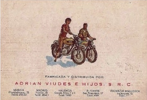 Y llegamos a 1955, cuado se decidió fabricar sus propias motocicletas junto con sus hijos creando la "Adrían Viudes e Hijos S.R.C.", con sede en calle Floridlanca 75, en Murcia capital.