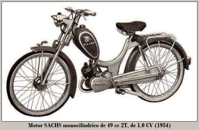 Motor SACHS monocilíndrico de 49 cc 2T, de 1.0 CV / 4000 rpm, 2 marchas con mando en puño giratorio del manillar, transmisión final mediante cadena, carburador Bing 01/12/22 HD 56 / ND 2.10 / NS 3, sistema eléctrico Bosch volante magnético 6V / 17W, bujía Bosch W 175 T 11, bastidor tubular de tipo abierto, suspensión D/T horquilla telescópica / basculante trasero con amortiguadores telescópicos, neumáticos D/T 2.00 x 23" / 2.00 x 26", frenos tambor central D/T, tanque 5.0 L, mezcla gasolina aceite al 4%, consumo 1.5 L/100 km y 35 kg, aproximadamente.