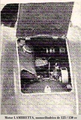 Motor LAMBRETTA monocilíndrico de 125 o 150 cc, de 2T, 5.0 CV, situado en la parte trasera, consumo 2.5 L/100 km, carrocería a base de una resina de poliéster y fibra de vidrio, velocidad máxima 100 km/h con un peso total alrededor de 300 kg, en modo biplaza.