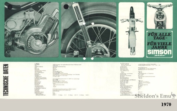 (³) las Simson S70 y Super 80 fueron motocicletas ligeras basadas en la serie S51, pero con motores de 70 cc. El nombre "Super 80" surgió de la necesidad de competir en la categoría de 80 cc precisando obtener el permiso de conducir, a pesar de que su motor tenía una cilindrada de tan solo 69,9 cc. Los modelos Super 80 se destinaron exclusivamente a la exportación a la RFA y se fabricaron por iniciativa del distribuidor de neumáticos Lange de Stuttgart. Esta serie se presentó a finales de 1983. Los motores S51 se rectificaron a 45 mm, pero se mantuvo la carrera de 44 mm. El muelle del embrague era ligeramente más rígido y la potencia era de 5.6 CV (la Super 80, de 6.8 CV). La velocidad máxima era de 75 km/h (la Super 80, de 79 km/h). De este modo, cumplían con la normativa de Alemania Occidental para "motocicletas ligeras" con una cilindrada máxima de 80 cc y una velocidad máxima de 80 km/h. En Occidente, sin embargo, tuvieron que competir con los modelos tope de gama de KREIDLER, ZÜNDAPP y HERCULES (Nürnberg) , pero en cuanto a precio, sin duda podían hacerlo: en 1984, la Super 80 costaba solo 1690 marcos alemanes frente a los 5498 marcos de la Hercules RX9. Posteriormente, todos los modelos se vendieron en la RDA como S70 y S70 Enduro.