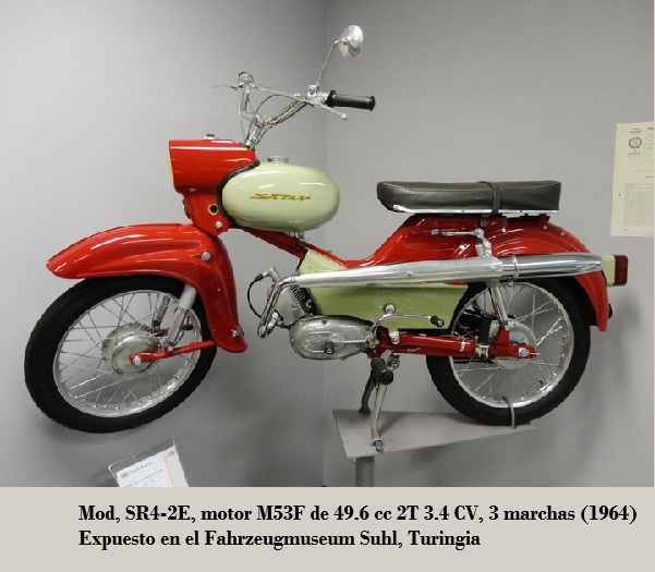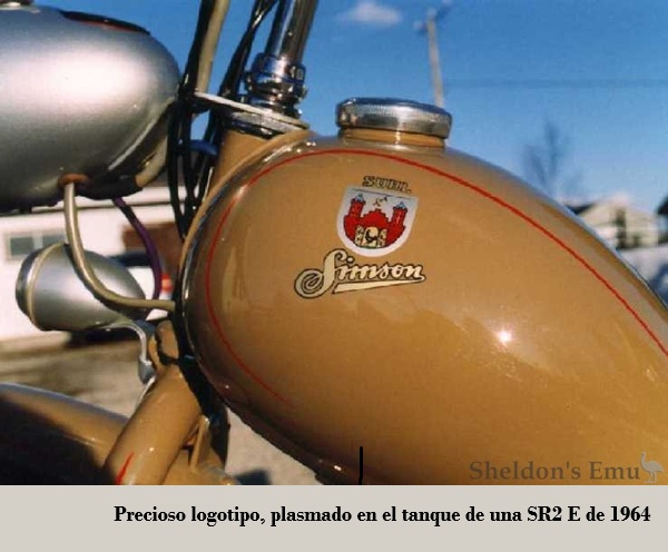 SR2E. Sin embargo, seguía montando el pequeño basculante trasero con suspensión de {aros Neimann}. Tras las críticas a la fragilidad del caballete central, se adoptó un nuevo modelo de chapa metálica . Se instaló un piloto trasero de mayor tamaño. En 1963, se introdujo un nuevo manillar plano de chapa metálica con el escudo de armas de la ciudad de Suhl . El modelo dejó de fabricarse en 1964, pero para entonces ya se habían vendido 164.000 unidades. 1958-1964