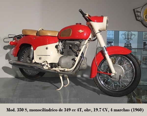 • 350 S: de 3 4T, distribución ohv, 19.72 CV / 6 500 rpm, monobloque de 4 marchas, transmisión por eje, bastidor doble cuna, suspensión D/T horquilla telescópica / basculante con amortiguadores, posteriormente con amortiguadores hidráulicos, frenos de tambor D/T, velocidad máxima 130 km/h. 1960