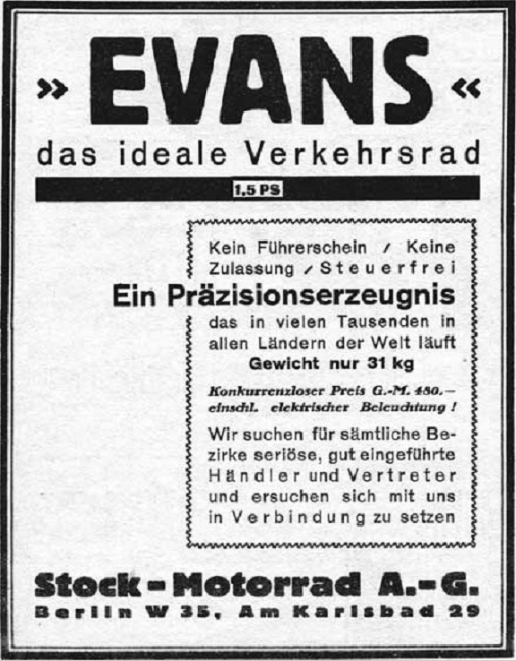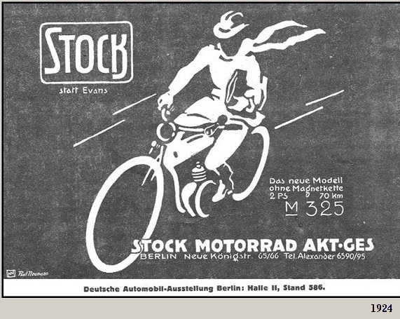 Las primeras motocicletas montaban motores de 119 cc 2T, fabricados bajo licencia de EVANS (Rochester), y que se vendían en Alemania con el nombre de EVANS-PONDORF, pero al cerrar la firma americana, dejaron de utilizarse, y es entonces cuando la firma Kahn (fabricante de cosechadoras) compró los derechos de producción, fundándose la "Stock Motorrad AG", pasando luego a ser la "Stock Motorpflug AG", con sede en la Neue Königstraße 65-66, ambas en Berlín.