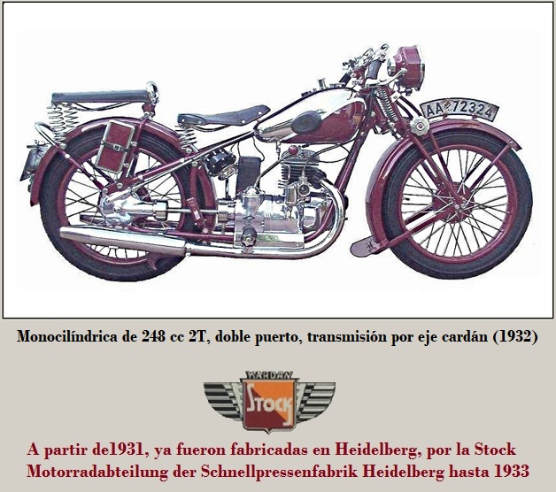 Estas motocicletas fueron evolucionando equipando todas ellas transmisión por eje, producidas en Heidelberg - a partir de 1931 - por la "Stock Motorradabteilung der Schnellpressenfabrik Heidelberg" (también propiedad de Kahn).