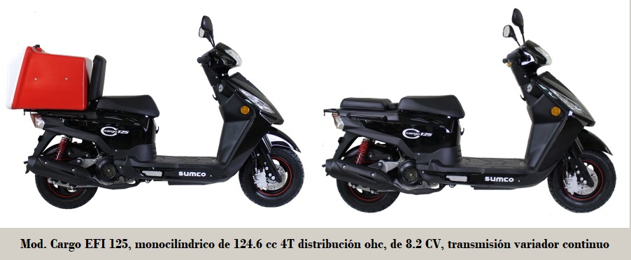 • Cargo EFI 125: 8.2 CV / 8 000 rpm, transmisión CVT, frenos D/T disco / tambor, neumáticos D/T 100 - 90-10", velocidad máxima 84 km/h, batalla 1380 mm, tanque 5.3 L (consumo 2.7 L/100 km), y 116 kg de peso.