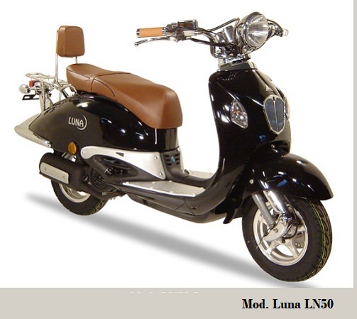 • Luna LN50: motor 2T de 49.6 cc, 3.1 CV / 7 500 rpm, automático con sistema Variomatic, frenos D/T disco ø 190 / tambor ø 119 mm, llantas D/T 3.50 x 10", tanque 4.0 L y 91 kg. 2008-