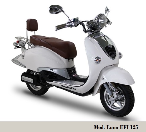 • Luna EFI 125: frenos D/T disco / tambor, batalla 1255 mm, tanque 5.0 L (consumo 2.6 L/100 km) y 97 kg.