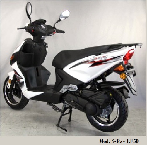 • S-Ray LF50: motor 2T de 49.6 cc 3.1 CV / 7 500 rpm, automático con sistema Variomatic, frenos D/T disco ø 190 / tambor ø 119 mm, llantas D/T 3.50 x 10", tanque 4.0 L