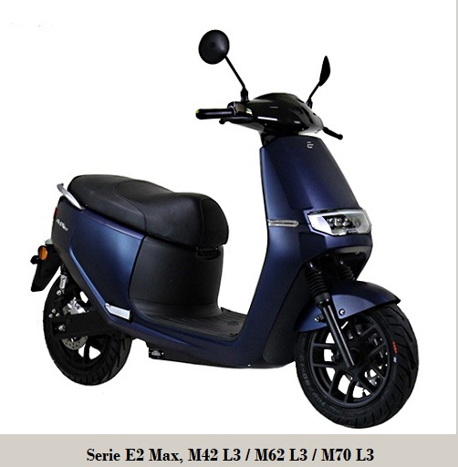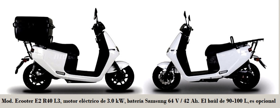 • Ecooter E2 R40 L3 (equivale a una 125 cc), potencia de 3.0 kW batería 64 V / 42 Ah, autonomía entre 65 y 100 km, baúl trasero de 90-100 L (opcional)