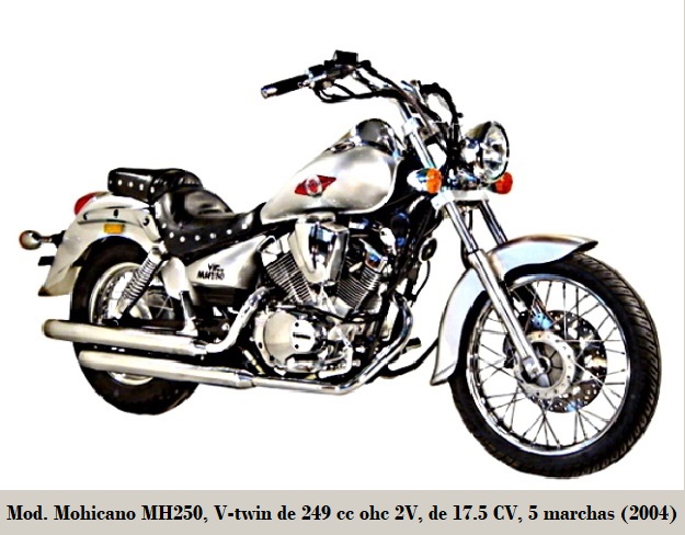 • Mohicano MH250: motor {V-twin} de 249 cc, 17.5 CV / 8 000 rpm, 5 marchas, refrigerada por aire, compresión 10.0:1, arranque eléctrico /