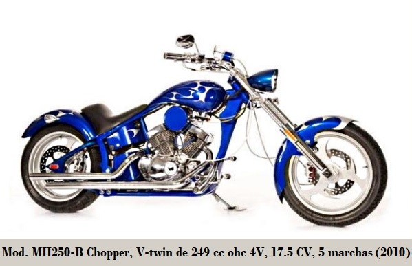 • MH250 -B Chopper: motor {V-twin} de 249 cc ohc {4V}, de 17.5 CV / 8 000 rpm, 5 marchas, refrigerada por aire, compresión 10.0:1,