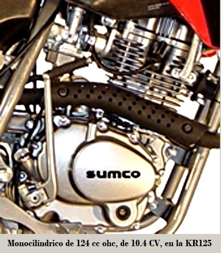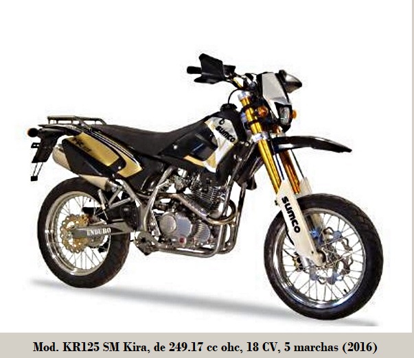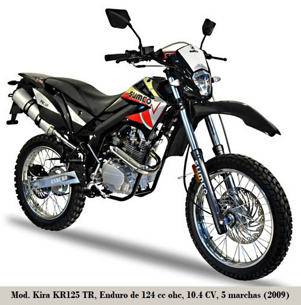 • Kira 125 Supermotard- KR 125 SM: de 13 CV / 8.250 rpm, 5 marchas, embrague multidisco en baño de aceite, compresión 9.0:1, refrigerado por aire, carburador, encendido electrónico Digital