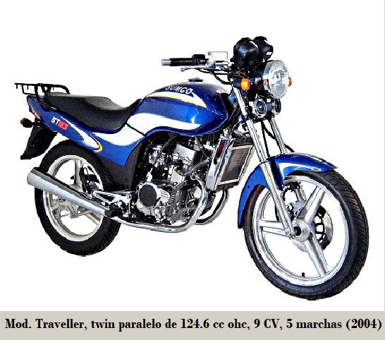 • Traveller 125: de 124.6 cc, 9.0 CV / 4 000 rpm, suspensión D/T horquilla hidráulica / 2 amortiguadores, frenos de disco D/T ø 245 / ø 190 mm, neumáticos D/T 100 - 80-16" / 120 - 80-16", batalla 1410 mm, tanque 8.0 L y 115 kg. 2004