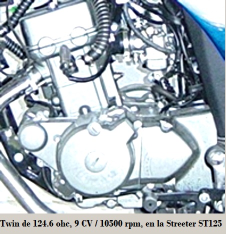 • Streeter ST125: motor twin paralelo de 123.85 cc, 15 CV / 10 500 rpm, 5 marchas, refrigerada por agua, frenos DT disco ø 240 / tambor ø 130 mm, neumáticos D/T 90 - 80-18" / 110 - 80-18", tanque 15 L y 132 kg.