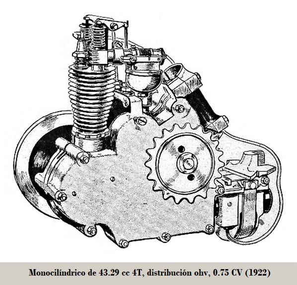 Tenía un volante motor externo con la magneto situada detrás del motor, equipado con un carburador de mariposa y transmisión final mediante cadena.