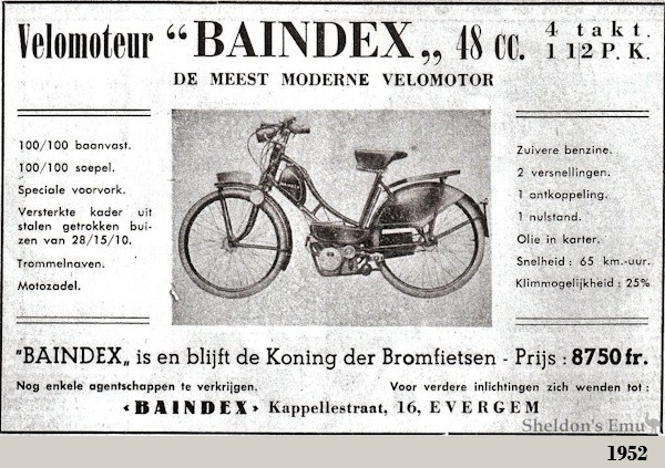 La "Baindex Mopeds", con sede en Evergem, capital de la región de Flandes Oriental, fue una pequeña empresa belga aparecida a principios de los años 50, y sólo durante corto tiempo, como fabricante de ciclomotores equipados con motor CUCCIOLO de 48 cc 4T, con distribución ohv, caja de cambios de 2 velocidades con embrague y punto muerto que fabricó bajo licencia, con la salvedad de montar unas varillas de empuje que reemplazaron por otras más delgadas ...