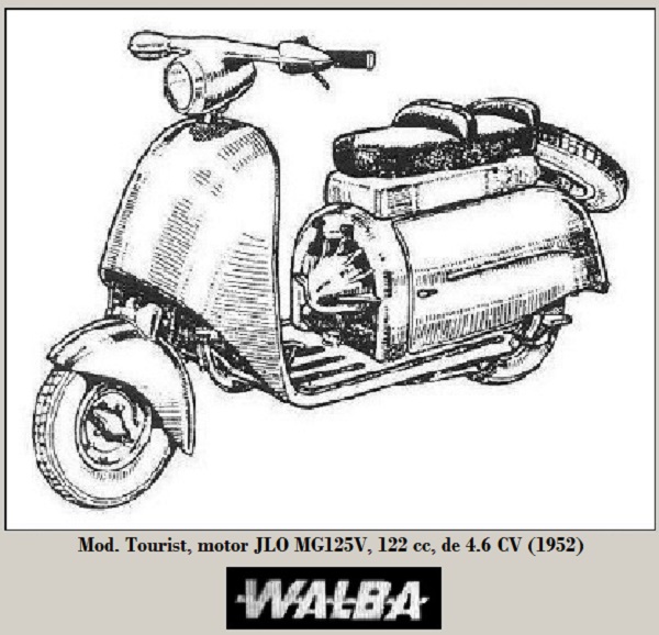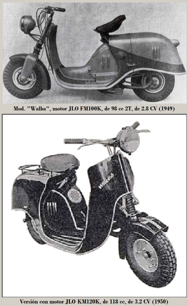 • Walba 120: motor FM120K de 118 cc, de 3.2 CV, velocidad 63 km/h y 72 kg de peso. 1949-1951