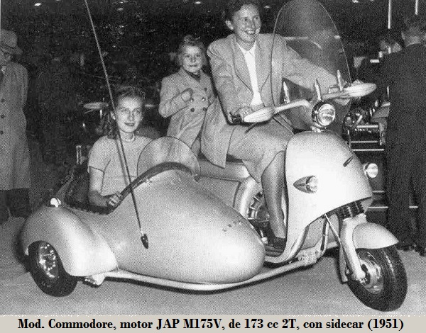 • Commodore: motor M175V, de 173 cc, 7.65 CV, 4 marchas, velocidad 85 km/h, tanque 8.5 L y 117 kg. 1950-1952.