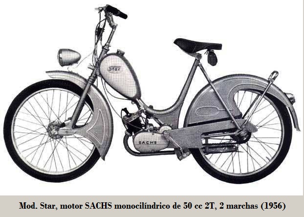 • Star: motor SACHS de 50 cc 2T, culata de metal ligero y cilindro de hierro fundido, motor monobloque de 2 velocidades accionado por el puño izquierdo del manillar, embrague en baño de aceite, sistema eléctrico de 6 V / 17 W, kick starter, suspensión D/T horquilla tipo leading link / rígida, neumáticos D/T 2.6 x 24", transmisión final mediante cadena, tanque 4.5 L, mezcla gasolina / aceite al 4%. 1953-1958