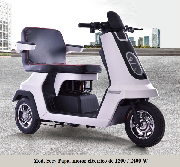 • Seev Papa Plus: como el anterior excepto motor de 2400 kW, 2 baterías ion litio de 60 V / 20 Ah, autonomía 100 km, recarga 10 horas, frenos D/T disco / tambor