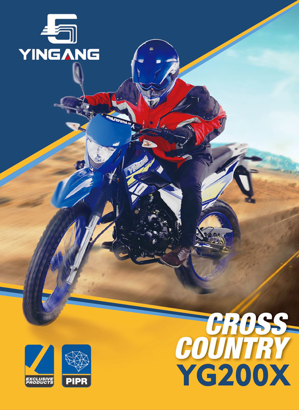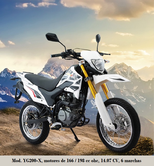 • YG200-X: motor YG163 FML (CG200, opcional), 14.07 CV / 7 500 rpm, 6 marchas, arranque dual (eléctrico / {kick starter}), neumáticos D/T 90-100 - 21" / 120-90 - 18", velocidad 95 km/h tanque 12 L (consumo 1.6 L/100 km) y 127 kg