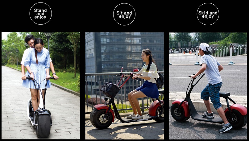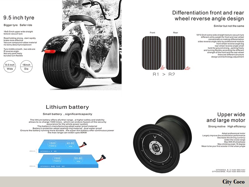 • City Coco: motor DC Brushless de 800 W, batería ion litio 60 V / 12 Ah, autonomía 45 km, carga 6 horas, frenos de disco D/T, neumáticos D/T 9.5 x 18" (distinto perfil de rodadura), capacidad ascensional 5%, velocidad 35 km/h y 57 kg