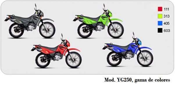 • YG250-GY: motor YG162FMJ, 18 CV /9 000 rpm, llantas D/T 2.75 x 21" / 4.10 x 18", frenos D/T disco / tambor, velocidad máxima 115 km/h, tanque 7.5 L, (consumo 2.1 L/100 km) y peso 130 kg.