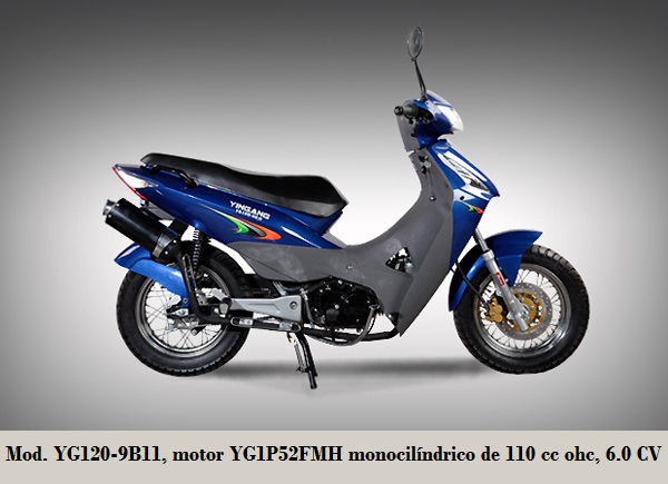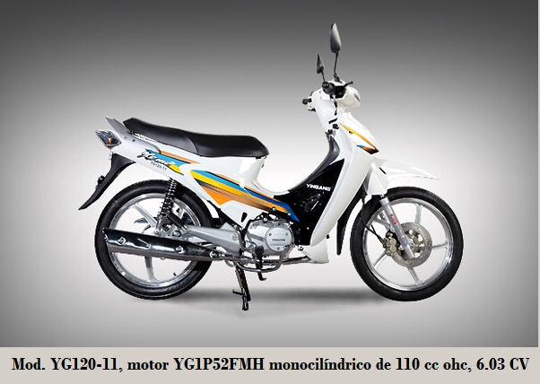 • YG120-9B11: motor YG1P52FMH de 110 cc, 6.03 CV / 7 500 rpm, compresión 9.0:1, arranque dual (eléctrico / {kick starter}), neumáticos D/T 110-90 - 13", frenos D/T disco / tambor, velocidad 85 km, tanque 3.0 L y 95 kg