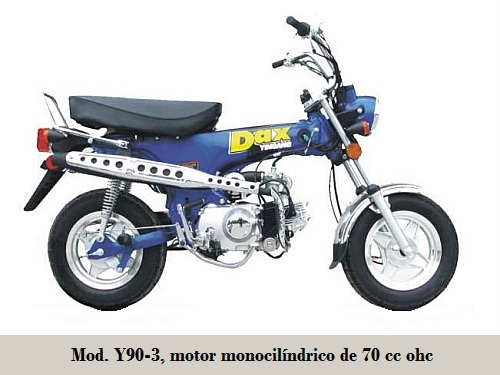 • YG90-3: motor de 70 cc, encendido clásico, llantas D/T 14 pulgadas, frenos de tambor D/T, {kick starter}, suspensión D/T horquilla telescópica / basculante con 2 amortiguadores hidráulicos
