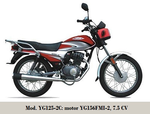 • YG125-2C: motor YG156FMI-2, 7.5 CV / 9 000 rpm, llantas D/T 2.75 x 18" / 3.00 x 18", frenos D/T disco / tambor, velocidad máxima 85 km/h, tanque 15 L, (consumo 2.2 L/100 km) y peso 120 kg.