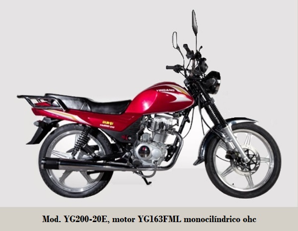 • YG200-20E: motor YG163FML de 200 cc, llantas D/T 2.75 x 18" / 3.00 x 18", frenos D/T disco / tambor