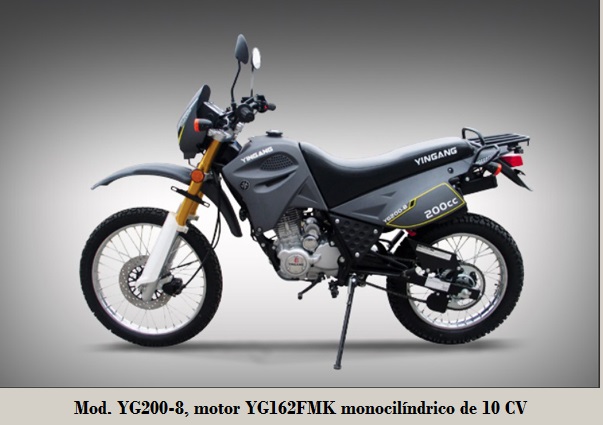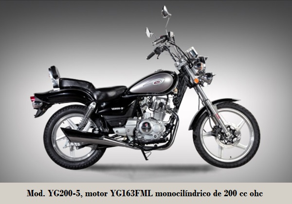 • YG200-5: motor YG163FML de 200 cc, neumáticos D/T 90-90 - 18" / 110-90 - 16", frenos D/T disco / tambor