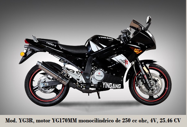 • YG3R: motor YG170MM de 250 cc {4V}, 25.46 CV / 9 000 rpm, compresión 11.0:1, refrigerado por agua, frenos de disco D/T 2 / 1, neumáticos D/T 110 - 60-17” / 140 - 60-17”, llantas de aluminio, frenos de disco 2 pistones D/T, suspensión D/T