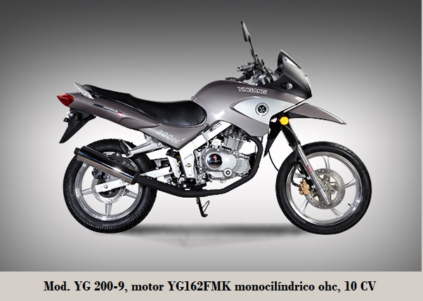 • YG200-9: como la anterior, salvo llantas D/T 2.75 x 17" / 3.00 x 16” y frenos de disco D/T.