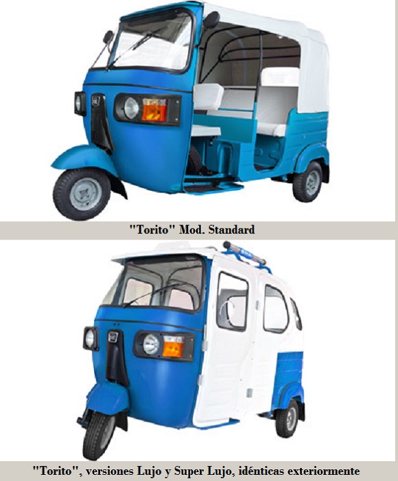 Los motocarros se denominan "Toritos" tanto en versiones moto taxi para transporte de pasajeros (2) con tres modelos: "Estándar", "Lujo" y "Súper Lujo" y, como motocarros para transporte de mercancía, en ambos con transmisión directa por eje con diferencial y paliers en las ruedas traseras