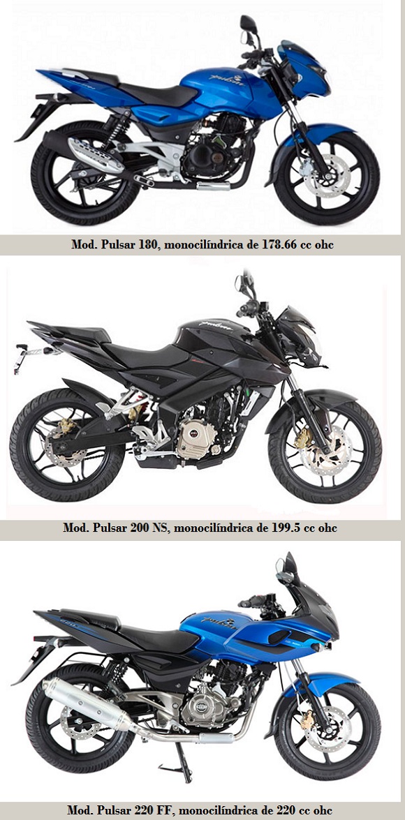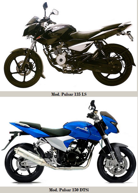 - Pulsar, 135 LS: 134.66 cc, (54.0 x 58.8 mm), 13.5 CV/9.000 rpm, compresión 9.8:1, carburador CV UCAL BS26 con sensor TPS (TRICS) con auto choke, encendido CD, CDI I digital microcontrolado con TRICS, arranque mixto (eléctrico/kick start), batería 12 V/5 Ah, 5 velocidades, suspensión D/T telescópica hidráulica HDS 130 mm de recorrido / amortiguador (2) Nitrox de 105 mm, frenos D/T disco de Ø 240 mm/tambor de Ø 130 mm, neumáticos D/T 2.75 x 17" - 41P/100 - 90 - 17" - 55 P, tanque combustible 8 L (reserva 2.3 L) y 132 kg de peso.